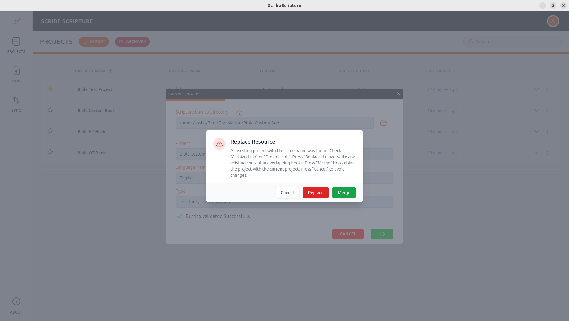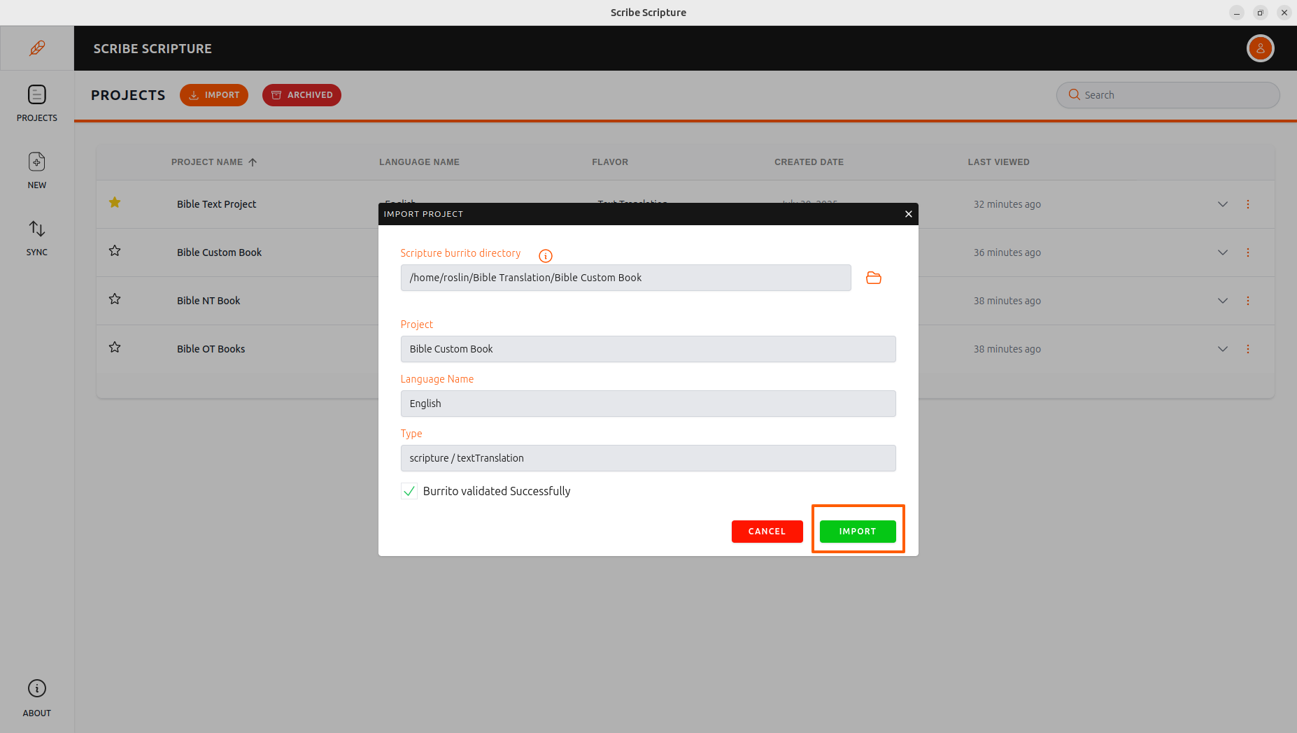 - The IMPORT PROJECT dialogue box will appear and display project details, such as Scripture Burrito directory, Project and language name, and project type