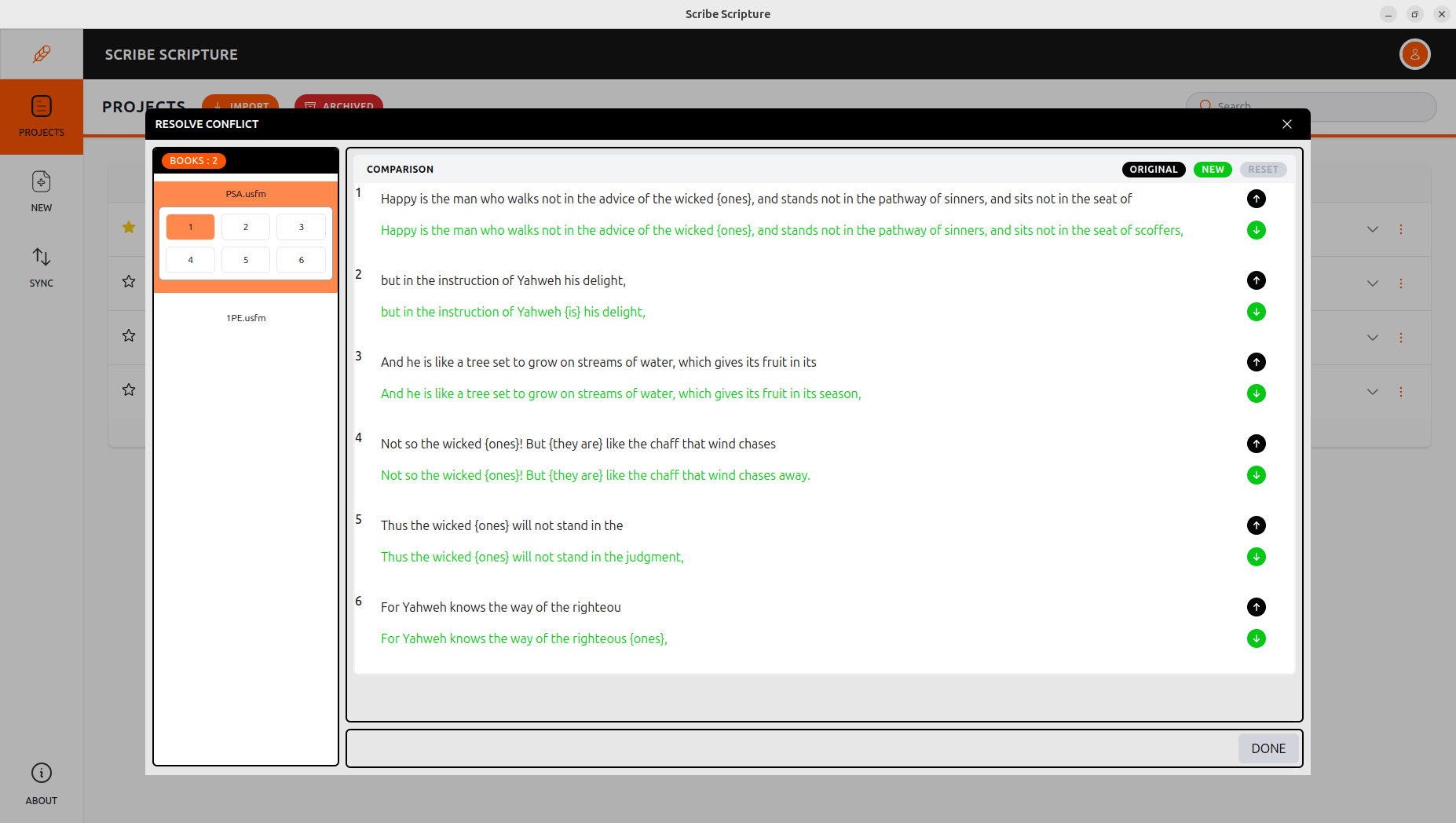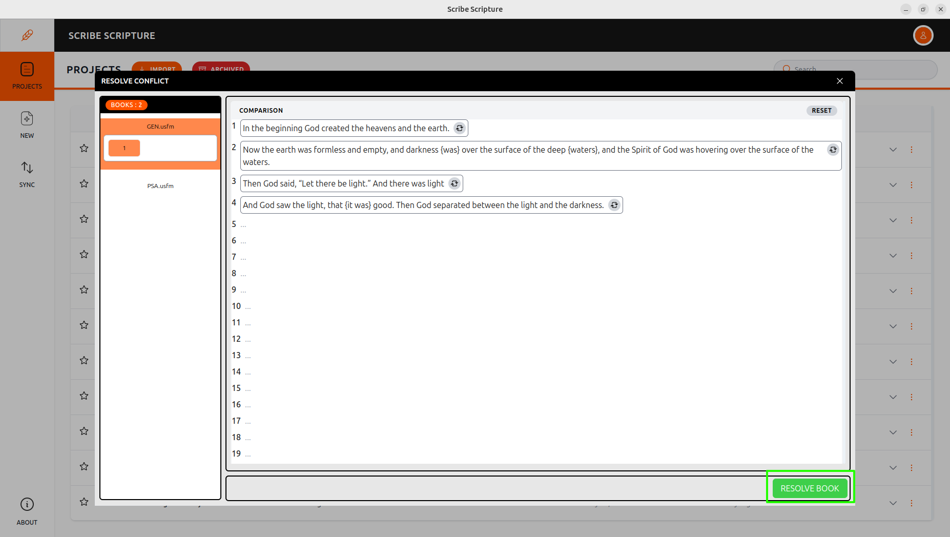 When all conflicts in a chapter are resolved, the Resolve Book button will appear.